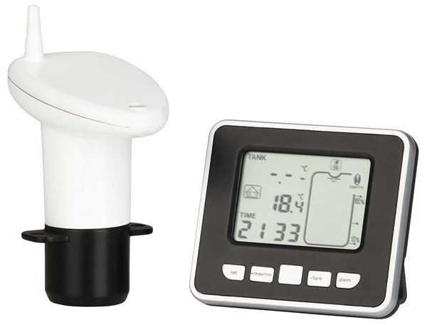 's transmitter unit measures the water level and temperature using an ultrasonic sensor. You can hang the receiver unit on a wall (hooks) or pull out the stand and place it on your kitchen bench top, table or desk. View your room's temperature, tank temperature and water level (represented by a 10 element bar graph). You can store min/max records and set alarms for specific water levels (high/low) or when empty.